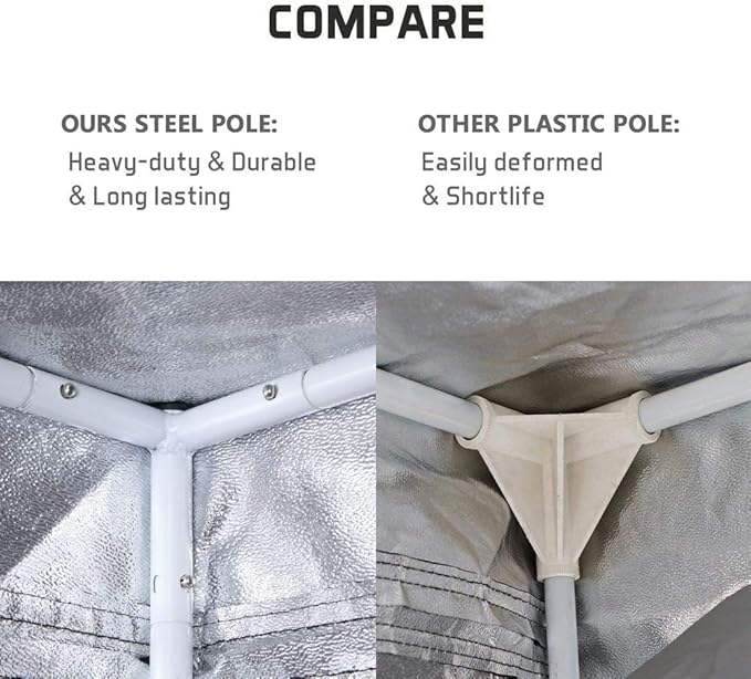 - 🌿 Tough Canvas & Durability- 600D material is tear proof and double stitched for perfect light blocking .Thick materials and durable zippers to make it a long-term use. It is is tear proof and water-resistance. Metal bars and metal connectors. Strong metal poles with easy click connector system. Our grow tent stands solidly