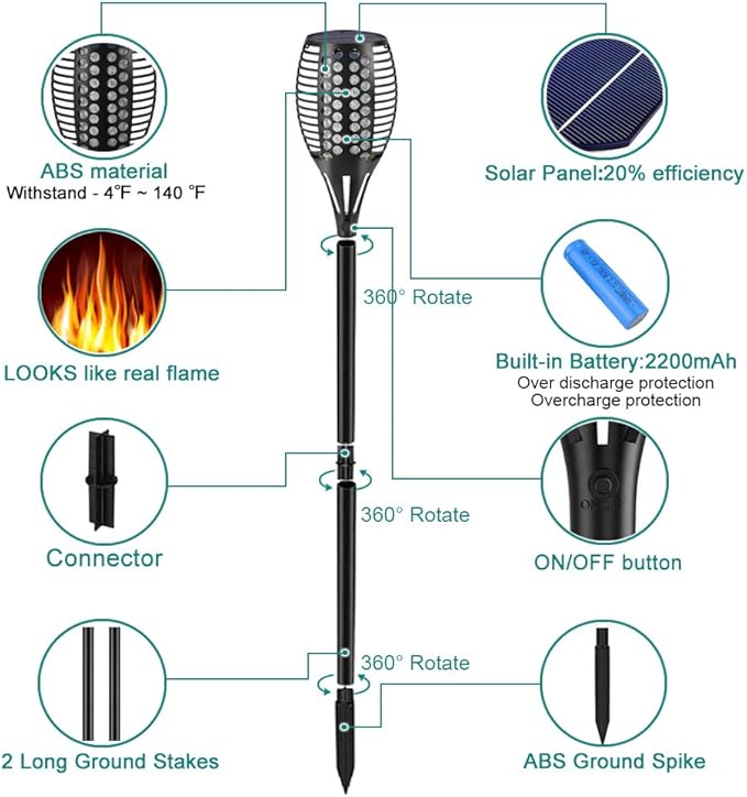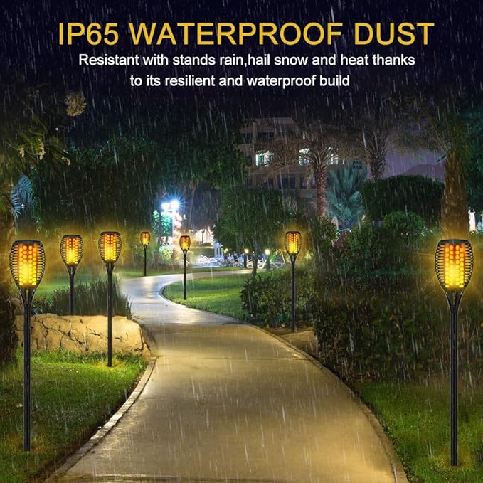 - 🔥AMAZING FLICKERING FLAMES SOLAR LIGHTS : This solar flame torch light is a safe alternative to the real “flames”. 96 LEDs in the light cast a safe, soft, mood-enhancing glow,provide a perfect campfire atmosphere for your patio, backyard, deck decor ,garden,party, BBQ and camping.