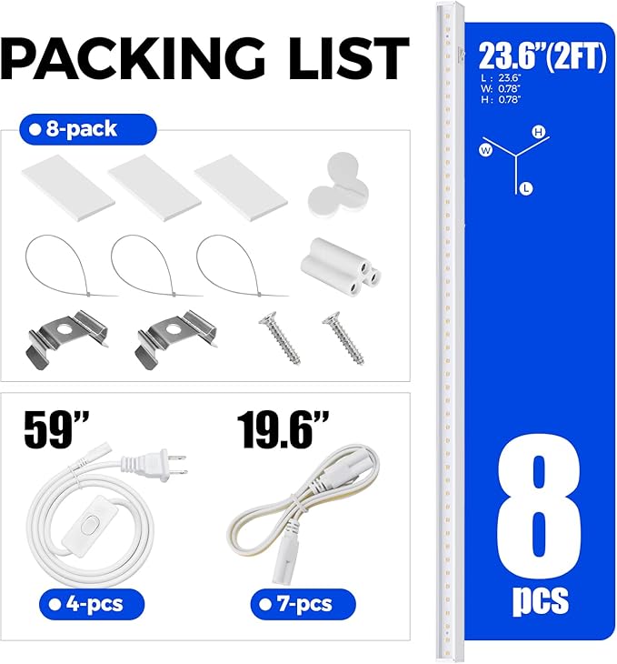 - What You Get - 8 x Barrina T5 Grow lights, 4 x Power cords with ON/OFF switch, 8 x Installation Clips, 24 x 3M Double-sided Tapes, 24 x cable ties, 7x Connecting Cords(20''), 8 x Small Connectors