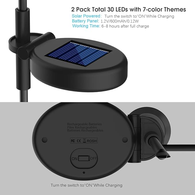 - 【Solar Garden Decor】These garden lights come with built-in rechargeable batteries, they can be automatically charged under sunlight. Fully charged battery will offer sustainable lighting for 6-8 hours after full charge.(Please note to turn the switch to “ON” while sunshine charging)
