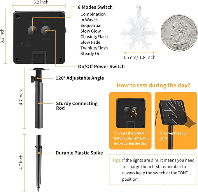 - 【【Auto On/Off Management】There is a built in photosensitive component in the solar panel, the Christmas Snowflake lights will turn on at dusk and turn off at dawn automatically; No need for manual operation, so convenient for lighting decor; If you have any questions with our products, Please feel free to contact us.