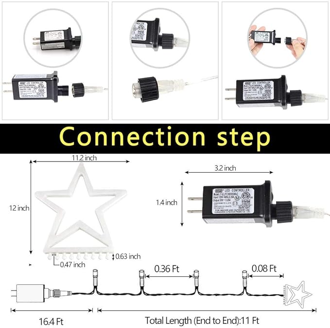 - 【Safe to Use & Easy to Install】30V low voltage plug with ETL certification to ensure safety use. Plug and unplug the power directly to turn on and off. Easy to be hung on a tree or roof to make a decoration for your house. When you install, simply hang the big star on an exterior wall, tree, or eaves, and drape the 9-string lights fall to the ground and fixed them.