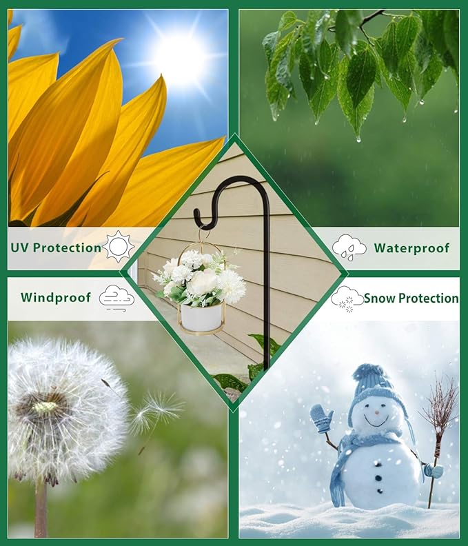 - ADJUSTABLE HEIGHT - The unique design of the bird feeder pole allows it to be freely adjustable to 44, 60 or 76 inches in height. Each shepherds hook includes 3 extenders with a length of 16 inches, it varies in height depending on how many extenders would be used. The maximum height of the plant hangers outdoor is 76in, which is very suitable for hanging bird feeder and squirrel baffle to keep squirrels or raccoons from eating.
