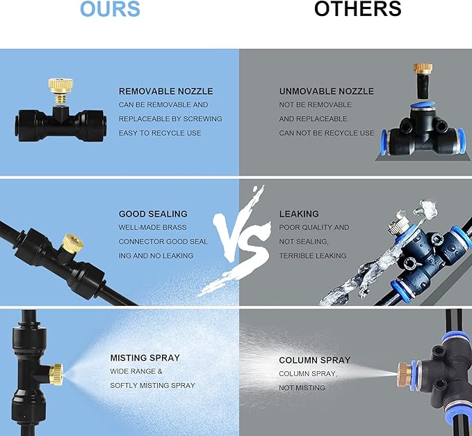 - 💧 Premium Leak-Proof Design: This misting system is built from UV-resistant black PE tubing, upgraded brass mist nozzles for smooth and drip-free spraying, and secure, leak-proof connectors, ensuring durable performance.