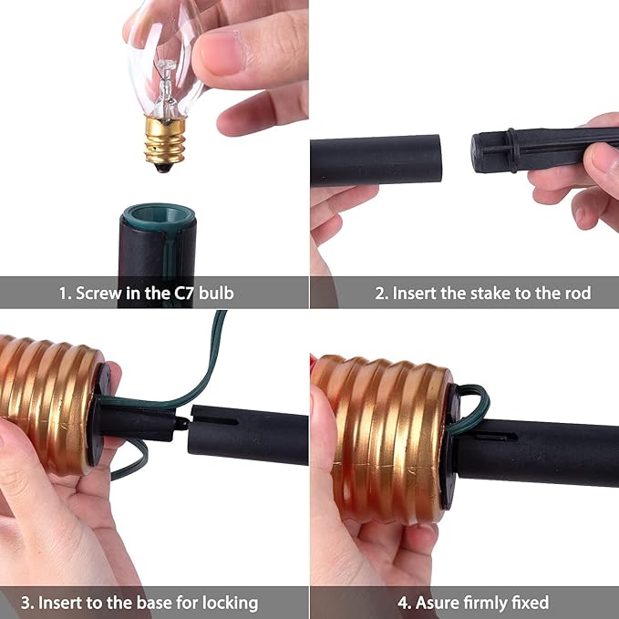 - Replaceable: Turn the yard Christmas lights support on the base and pull out the internal C7 light bulb from the outer jumbo c9 bulb, screw out the damaged bulb from the bulb holder, then screw in a new one gently. And turning off one light will not cause the other lights to go out, which is very user-friendly. These light strings are extremely durable and have an average life of 5,000 hours