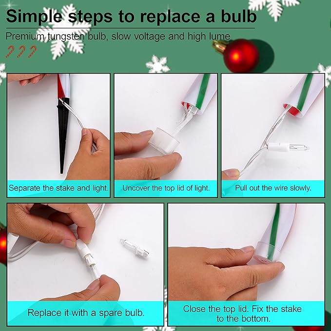 - đăSafe & DurableăPassed UL certification test. IP 44 waterproof feature ensures the Christmas pathway lights can illuminate under a rainy, snowy day. Provide 4 spare fuses and bulbs for replacement in case.