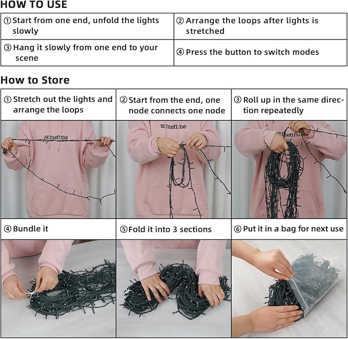 - ☃️【34FT 380 LED CHRISTMAS LIGHTS】The patented outdoor christmas lights for house with 34ft length & 19 loops & 380 mini bulbs, has an end-to-end plug that can be extended to 102ft(3 sets), which is enough to cover a wide area. Emitting a warm white glow, they'll look fabulous hung around your home.