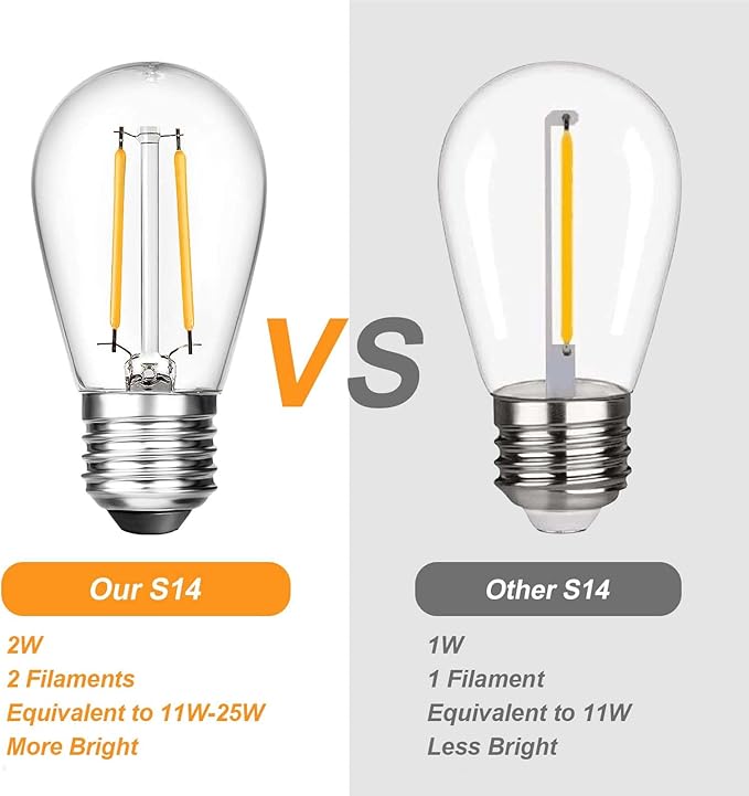 - 💡【Outdoor Replacement Bulbs】This 2W S14 LED filament Edison bulb is ideal for E26 based outdoor string lights. The 2200K warm white color creates a cozy and romantic ambiance. It is equivalent to a 20-watt incandescent bulb, but it is much brighter, more energy-efficient, and has a longer lifespan.