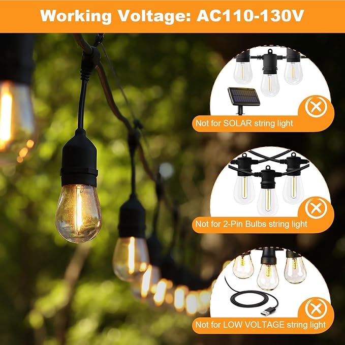- ⚠️Voltage: Works with 110V-130V only (⚠️ Not for low-voltage solar string lights like 3V/6V).