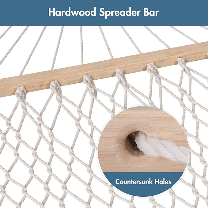 - SPREADER BAR HAMMOCK: 52 inches hardwood spreader bar has countersunk holes, hence reducing the friction between the rope and wood, offering maximum durability and stability. Our hammock significantly outperforms others’ non-countersunk varieties