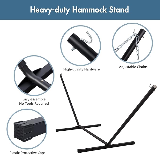 - STEEL STAND FOR HAMMOCKS: Hammock stand is made of heavy-duty gauge steel, featuring safe, durable and weather resistant. It can be easily assembled in minutes without any tools. Including a magazine bag and a cup holder, this 12 ft hammock with stand included is very suitable for reading, relaxing, and resting in the garden, terrace, backyard, poolside or balcony