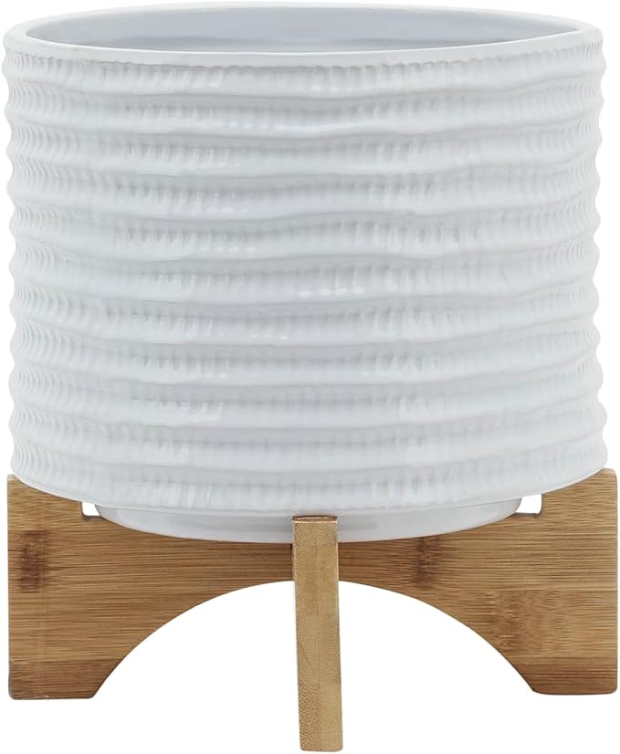 8" Ceramic Planter Stand, White with Wooden Base, Indoor/Outdoor Planter with Stand for Your Succulents and Small Plants, White Planter
