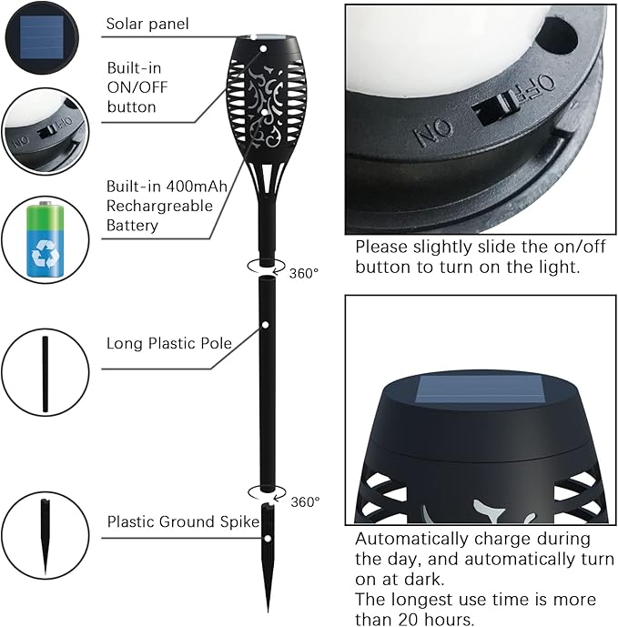 • đŸ”„ă€Auto Charge & Auto Light Up】: Solar tiki torches for outside automatically collect solar energy all day in direct sunlight and turn it into electricity to continuously charge the battery and include a photosensitive control switch on its solar panel, From dusk to dawn (no sunlight), the lights are automatically turned on, and when the sun rises (the solar panel receives sunlight) the lights will automatically turn off and charge automatically. Convenient and practical.