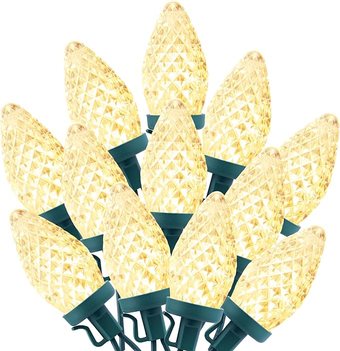 - 【 Brilliantly Bright Glow 】- These lights feature large, faceted C9 bulbs made from durable polycarbonate, offering good brightness, color saturation, ruggedness and reliability. Built-in SMD LED creates vivid lighting effects; the diamond facet hole design prevents stagnant water. Bulbs with vibrant colors will never fade, chip or crack