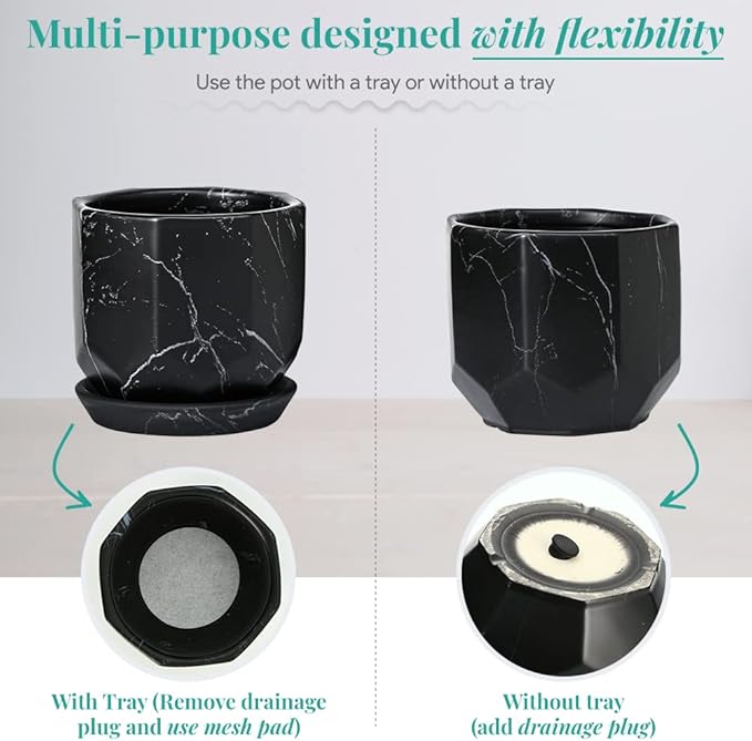 - [PRODUCT DETAILS: SET of TWO] Package includes two black planters, a removable tray/saucer, drainage hole, cotton mesh pad, and silicon drainage stopper. Small Pot: 4.3 Inch outside diameter and 4.2 Inch height with tray and Medium Pot: 5.5 Inch outside diameter and 5.4 Inch height with tray. The thickness of the pot is around 0.75 cm. Plants are not included. Marble detailing on each piece may vary due to the Hand Glazing process