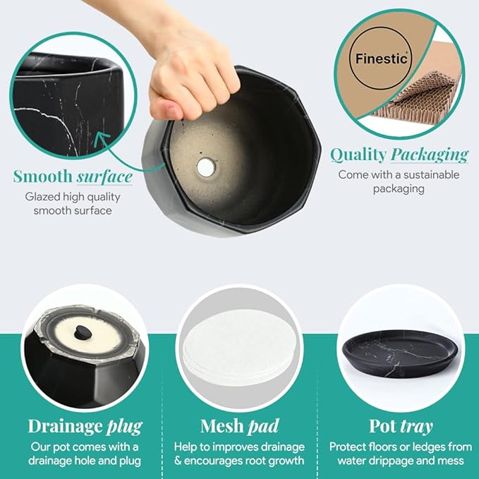 - [WHAT MAKES IT PREMIUM PRODUCT] Finestic planters are not ordinary plant pots. Pots are designed locally in the US and made with the best manufacturing standards. Hand Glazing with Marble Pattern takes twice the cost and effort than regular ceramic pots. Pot comes with saucer matching tray, drainage hole, drainage plug, and mesh pad. Higher thickness and sustainable packaging are another addition to the premium offering.