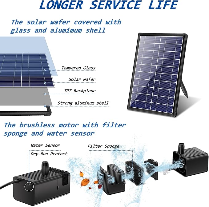 - MORE POWERFUL SOLAR FOUNTAIN KIT: Our solar panels are covered with glass, which can protect the solar wafers well and does not affect the conversion efficiency of solar energy. These solar panels have a power of 7.5W and output a voltage of 10V to make the pump work more stable and powerful.