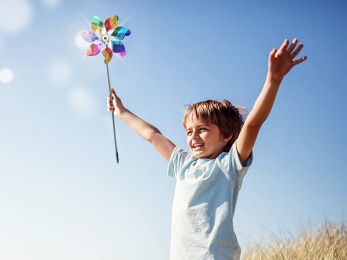 BATTIFE 10 Pack Sparkly Rainbow Pinwheels, Reflective Wind Spinner for Yard and Garden with Stakes, Decor Windmill to Scare Birds Away for Lawn and Patio