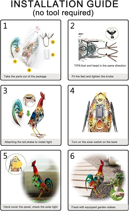 - Perfect Garden Decoration: This solar powered Metal Rooster Statue is suitable for garden, trees, flowers, flowerbed, fence, walkway decoration. You can enjoy vivid color during the daytime and soft light at night.
