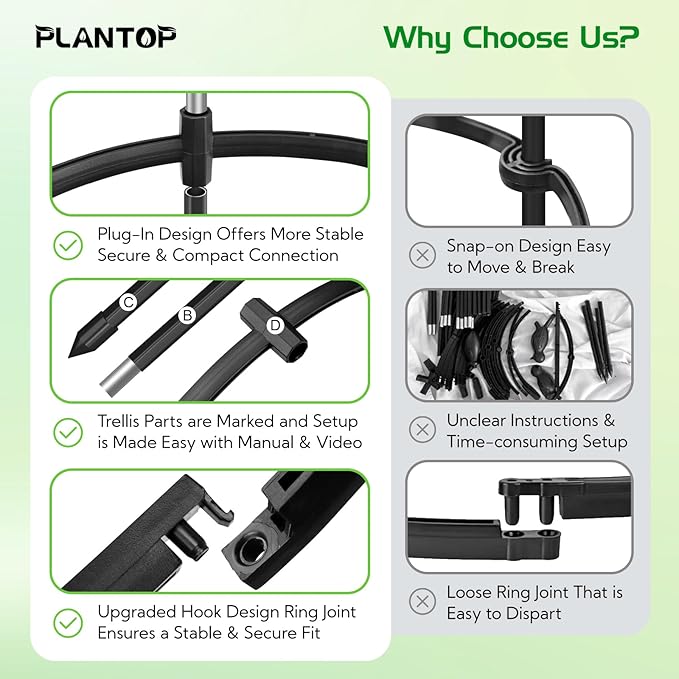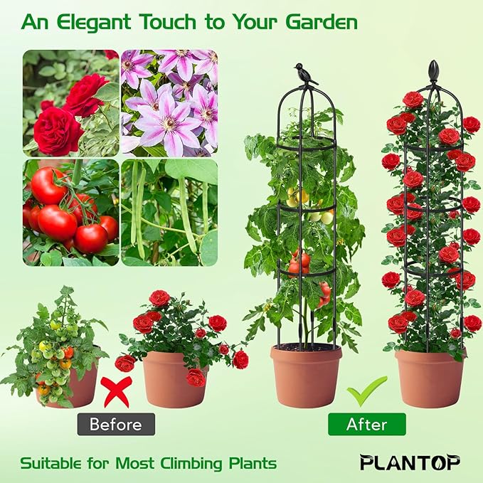 - đ ăSturdy & Compact Plant TrellisăDifferent from other plant support trellis, PLANTOP vertical tomato tower garden obelisk trellis have the newest plug-in connection, and unique double-layer metal tube built-in interface design to stay together tighter and more stable. The durable structural plant cage trellis can carry heavy loads, ensures that your plant's fruits do not weigh down the stem and keep your plants upright and elegant, adding life to your home!