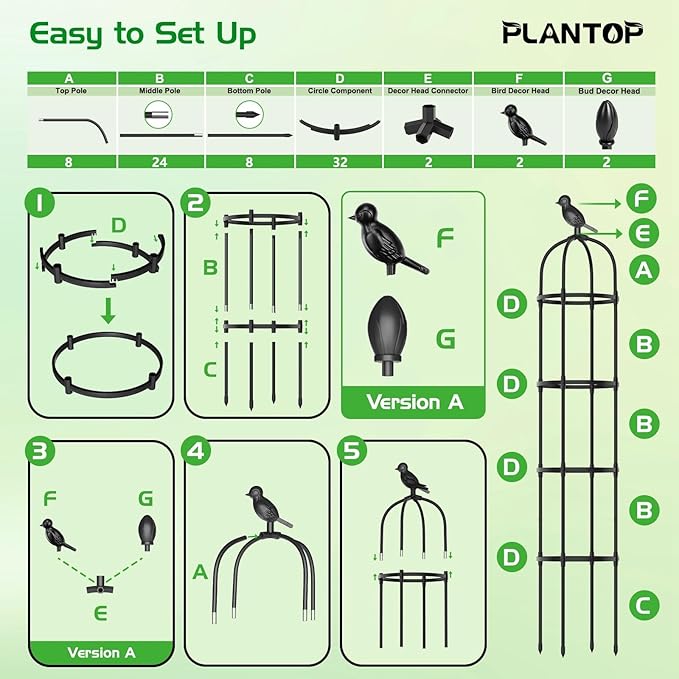 - đăEasy to Put Together with MarkăThis Trellis for Climbing Plant is easy to install by one person without tools. The most important advantage - Exclusive letter stickers. You can effectively identify each component, referring to Figure 5 and the video for quick installation. With a detachable design, the plant cage trellis is easy to take apart and only occupies a little space. For environmentally friendly, you can also store these garden tower trellis for next year's use.