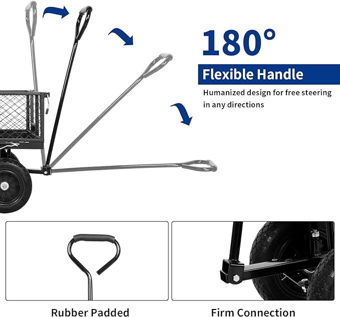 - EASY ASSEMBLY: The garden cart is designed to be easy to assemble. With simple and straightforward instructions, you can quickly put the cart together and start using it right away. The 180° rotating handle allows for easy maneuverability, while the quick-release feature makes it easy to unload and load items quickly.