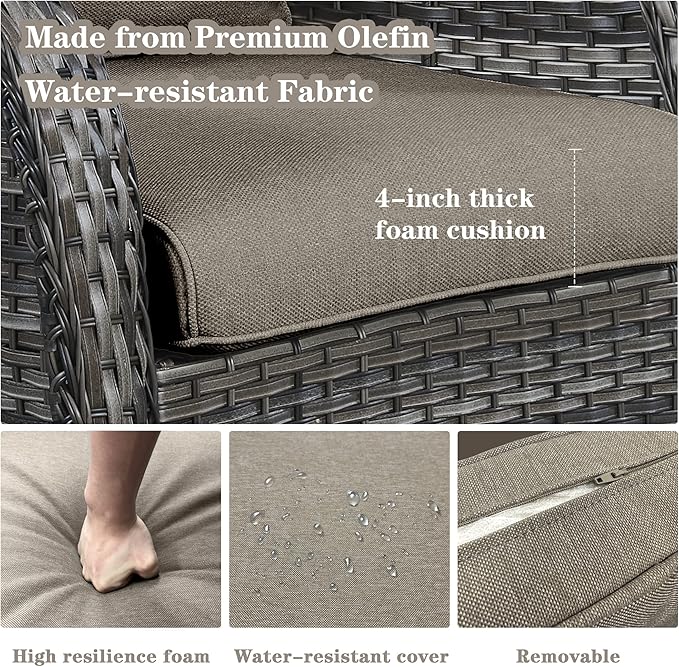 - Comfortable And Easy To Clean: Each glider chair and sofa in this outdoor set comes with a 4-inch thick foam seat cushion and an 8-inch thick cotton back cushion, which is ergonomic and enhances the overall comfort of the chair. The chair cushion cover is made of outdoor professional olefin fabric which is water resistant, and the seat cushion is equipped with zippers that are removable and easy to clean.