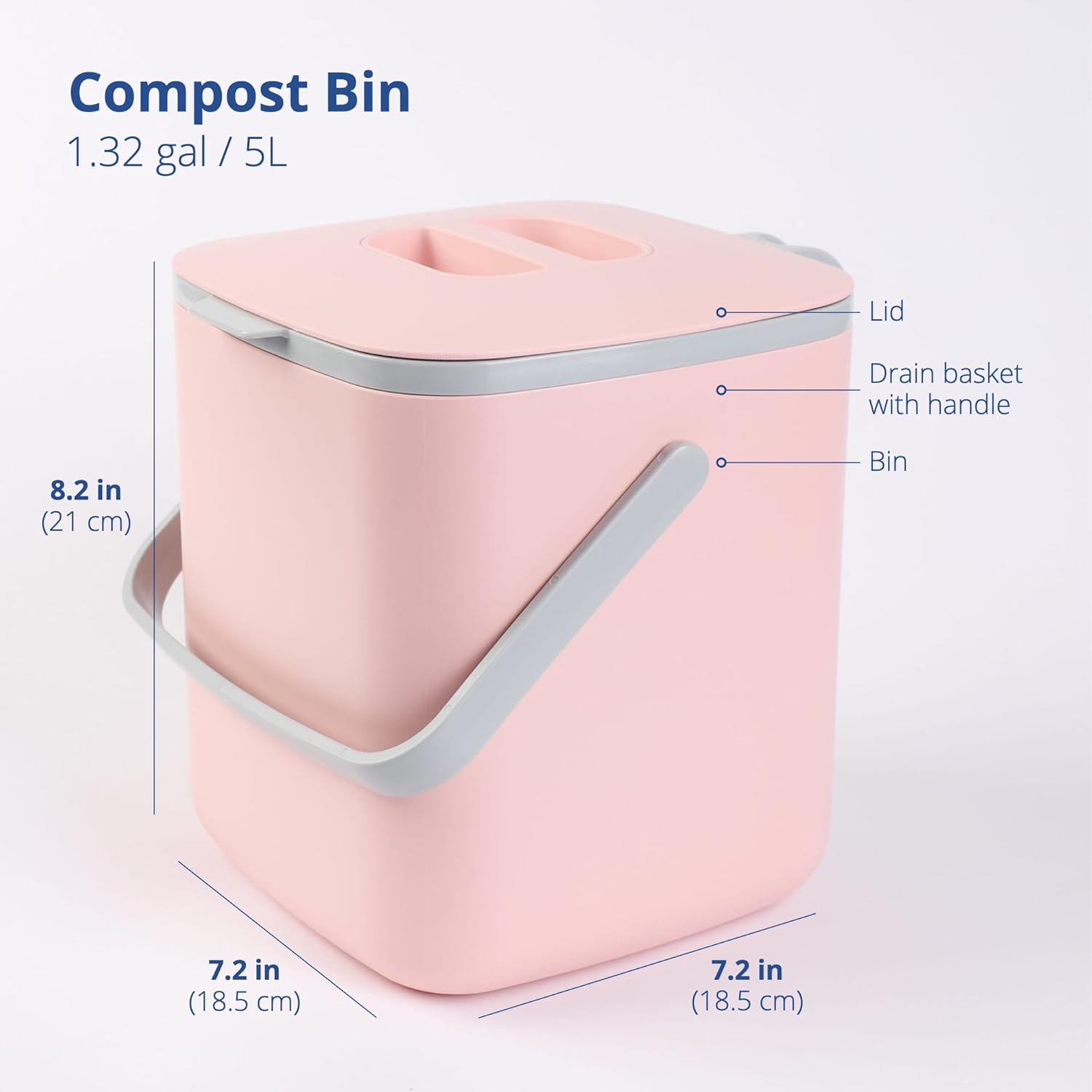 BLUE GINKGO Kitchen Compost Bin [5L / 1.32 GAL] – Filter-Free, Odor-Tight Countertop Food Waste Pail with Handles (Made in Korea, Pink)