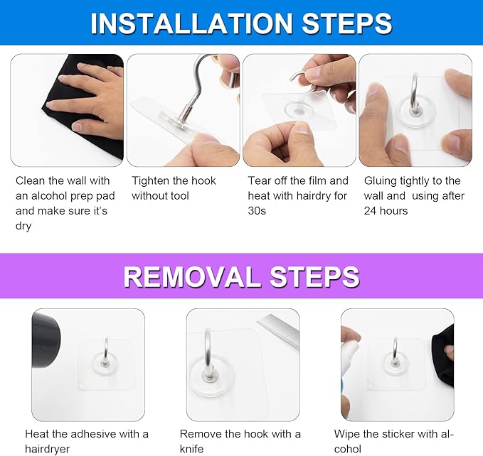 - [EASY INSTALLATION] sticky hooks for hanging can be affixed to a variety of surfaces, such as glass, metal, wood, tile, and concrete, without the need for tools like screws drills