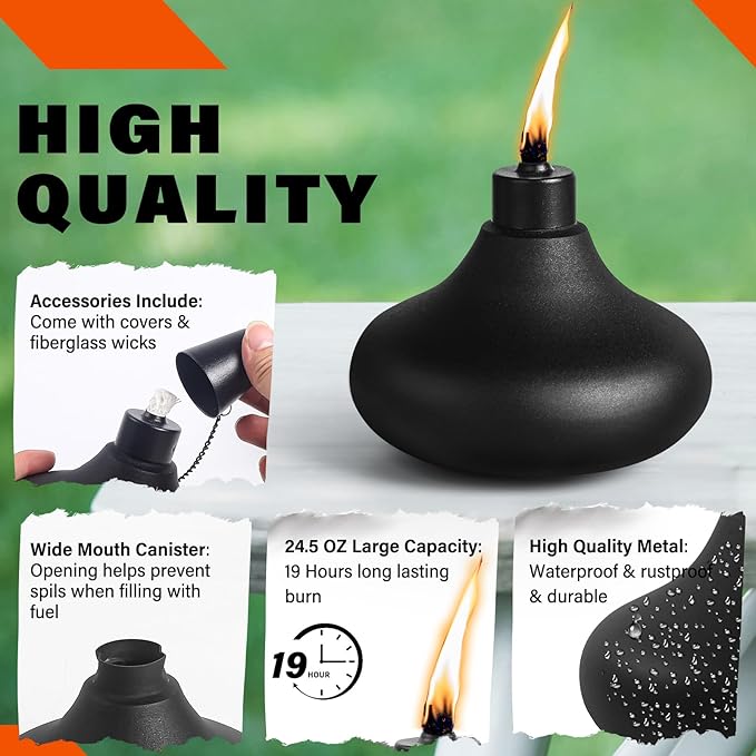 - ✿High Quality Metal Table Top Torches: Our Metal Table Top Torches made of premium metal. durable and lightweight. Each tabletop torches hold approximately 24.5 oz of fuel, allowing the burning time more than 19 hours .