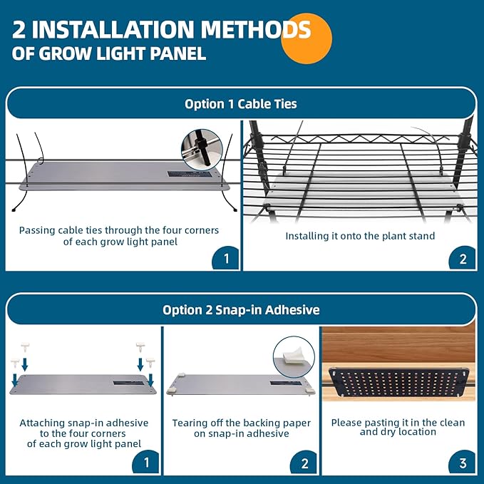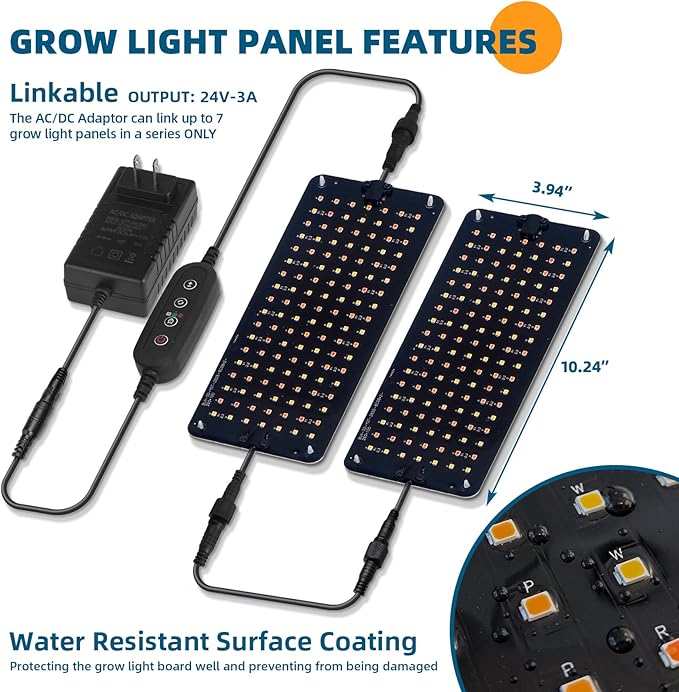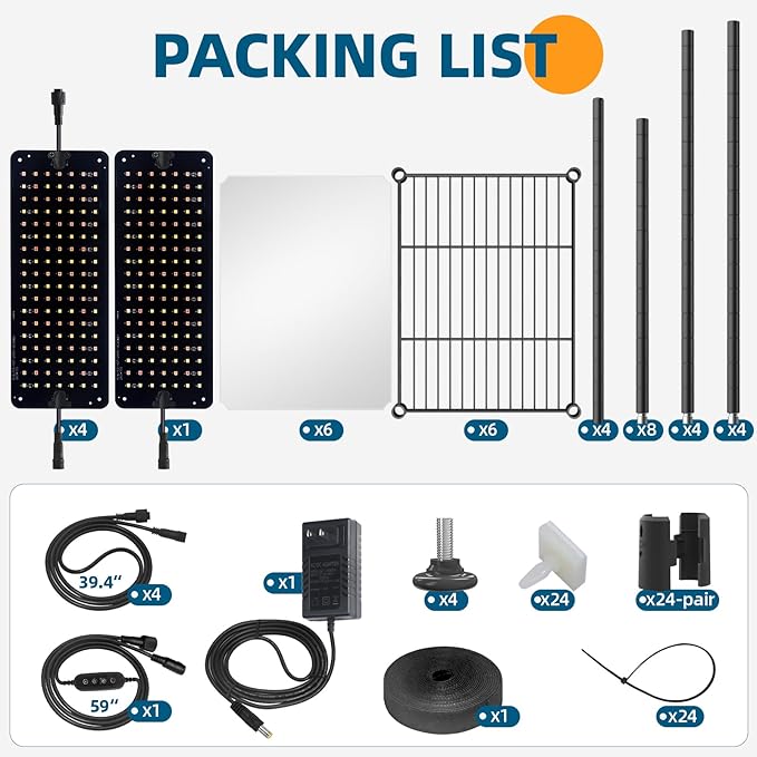 - What You Get: 5 x Barrina Grow Light Panel, 1 x AC/DC Adaptor, 1 x Power Cord with Turn On/Off Timer, 4 x Connecting Cord, 1 x Hook and Loop Tape, 24 x Snap-in Adhesive, 24 x Cable Tie, 6 x wire shelf, 6 x PP pad, 1 x Accessory Kit for Plant Shelf, 1 x Installation Manual