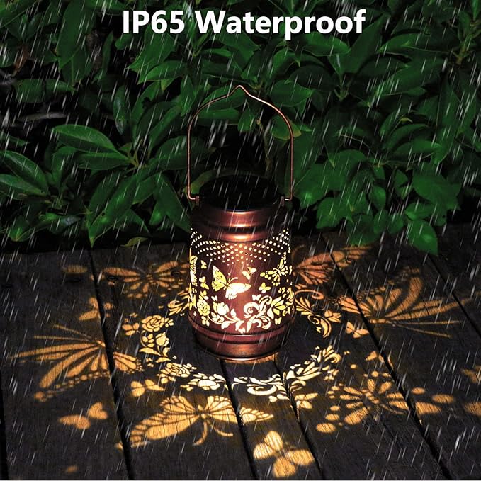 - Graceful Decorative Design - The retro appearance, with gold copper color and hollow out metal veneer, the solar outdoor lanterns casts bright and warm light in darkness, accompanied by gorgeous and graceful butterfly patterns, adding a beautiful atmosphere to the surrounding environment.