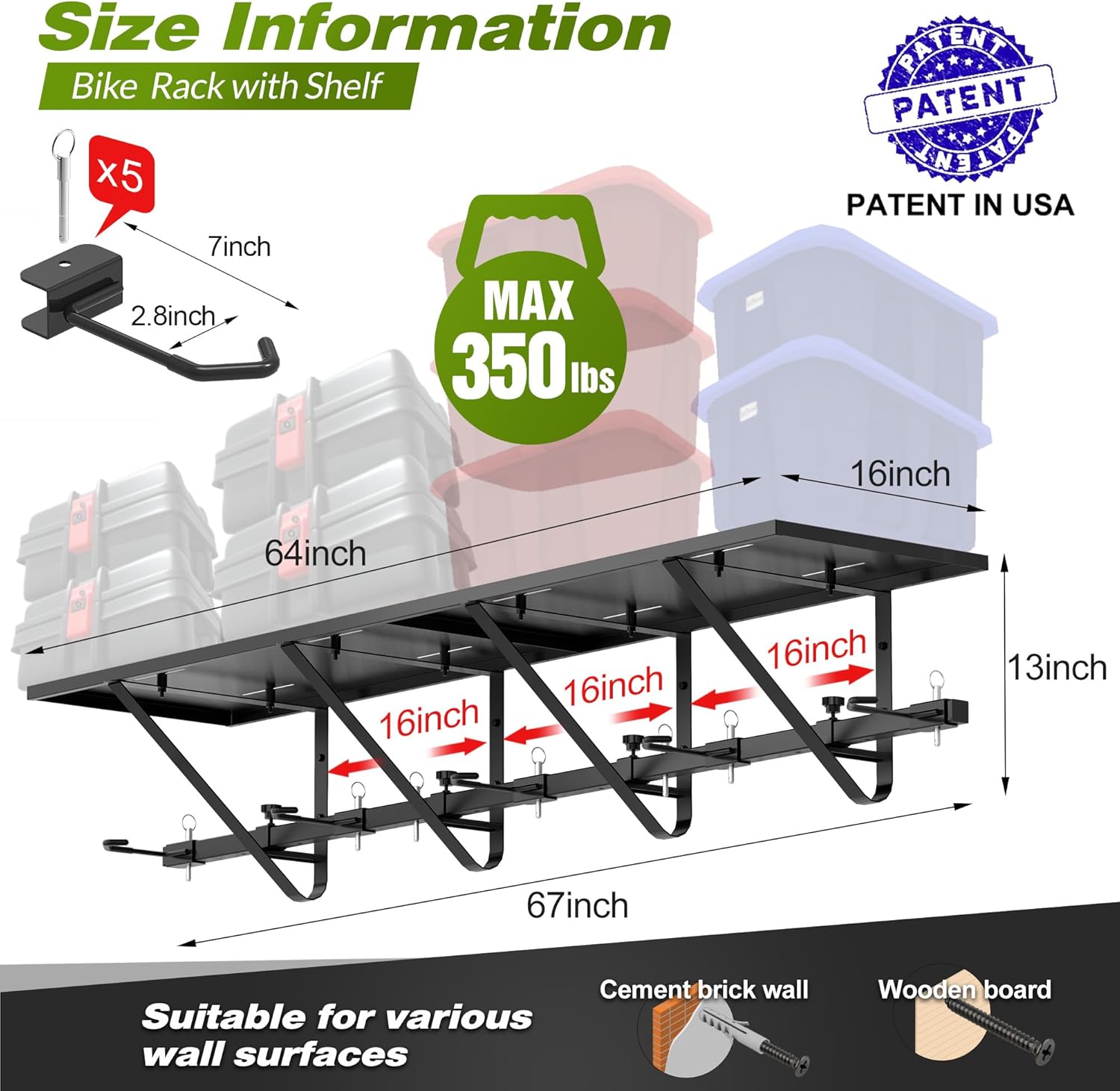 - High Capacity: 68" elongated bike rack with a 64x15inch large space size shelf provides high-capacity storage. It holds up to 300lbs on the rails and 100lbs on the shelf, maximizing space and organizing your garage effectively. The 16" hook spacing perfectly fits 5 bikes. Equipped with hexagonal high-strength self-tapping sand matching ribbed plastic anchor to ensure that both wooden walls and brick walls can be installed. The bike storage can thus free up crucial space in your garage or home.