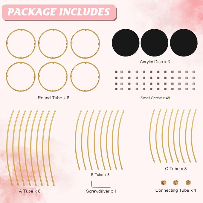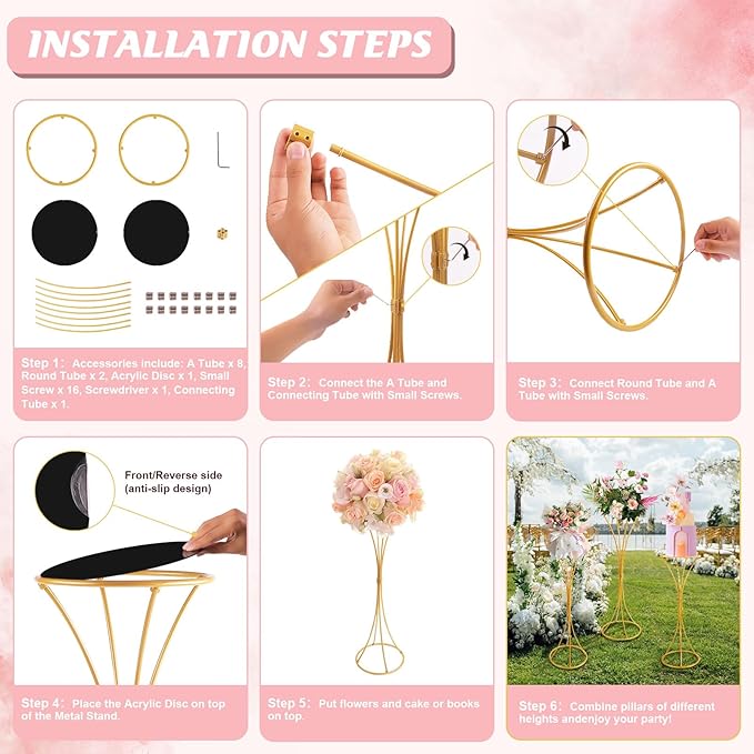 - Sturdy Enough - Thanks to its high-quality materials, this flower stand for weddings is not easy to bend, with stable structure, does not shake, sturdy enough to hold heavy items. Therefore, you can place any decoration you like on the metal plate of the gold flower vase, whether it is a heavy vase, large floral arrangement, light silk flowers, or hanging flower vines, it will hold up well without falling over.