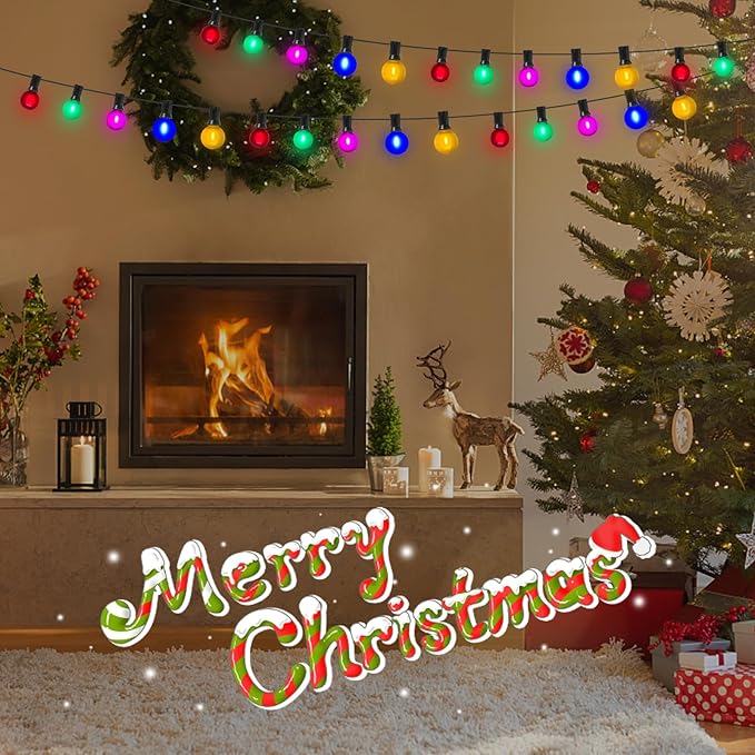 - ✨Safety and Energy Efficient: 50Ft G40 LED Christmas string lights Outdoor with 27 led shatterproof frosted multicolor bulbs (2 Spare), C7 or E12 Candelabra base, each G40 frosted multicolor led bulb 0.6W, outdoor led christmas multicolor patio string lights is more than 90% energy efficient than vintage edison globe string lights. G40 frosted colorful bulbs string lights emit a mesmerizing, multicolor brilliance, creating a captivating and festive atmosphere.