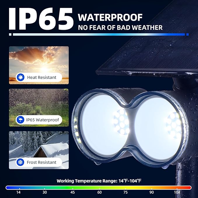 - IP65 Waterproof and Auto On/Off: These solar lights for outside turn on automatically at night and turn off at dawn. Resistant to snow and heat, they are functional in temperatures ranging from -20°F to 122°F. The IP65 waterproof rating ensures superior lighting and extended durability