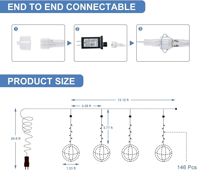 • 【Connectable Globe Lights】 A string of garden globe lights with 4 luminescent balls, each measuring 15.74inches in diameter. Each ball features 136 LED bulbs, with a 3.77ft drop length for each ball and a 3.28ft gap between two balls. These lights can be connected to one another, offering the flexibility to extend up to 3 strands, allowing you to customize your lighting arrangement and festive decorations for a larger area as needed.