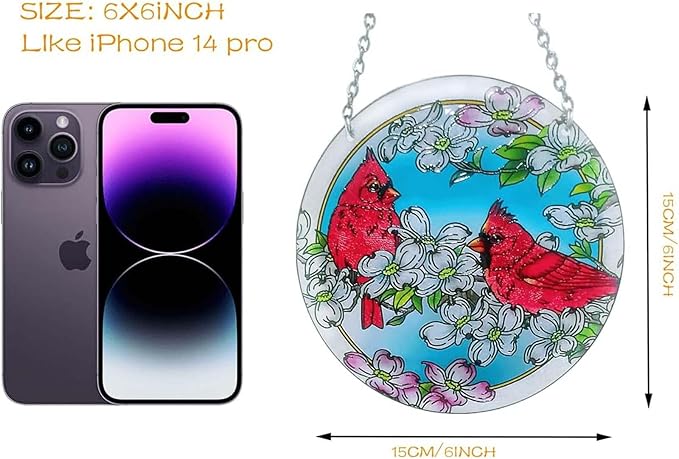- 【Pretty Window Decoration】This is a very pretty cardinal suncatcher. It's not huge (about the size of your hand) which is the perfect size for the windows. It adds a nice accent to a window without dominating it .so you can look outside to spot real Cardinal.The colors are bright and catch the sun beautifully. It comes in a color box gift packaging.