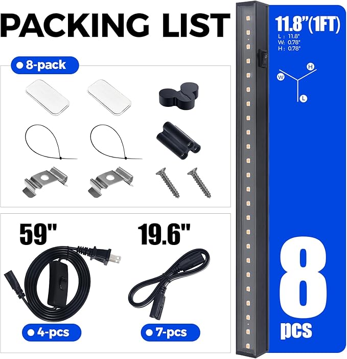 - What You Get: 8 x Barrina t5 Grow Light, 4 x Power Cord with ON/OFF Switch, 7 x Connecting Cord(20''), 16 x Installation clip, 16 x Cable tie, 16 x Magnetic bar with double-sided tape, 8 x Small connector, 8 x Dust cap