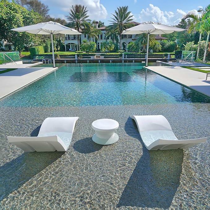 - SAFE FOR ALL POOLS - NO METAL means it will not rust, corrode or affect your pool chemicals. Whether your pool is saltwater or chlorine, vinyl or fiberglass, commercial or residential, this in-pool lounger and table works in depths up to 9” of water; for deeper ledges, please see our Signature Chaise Deep pool loungers.