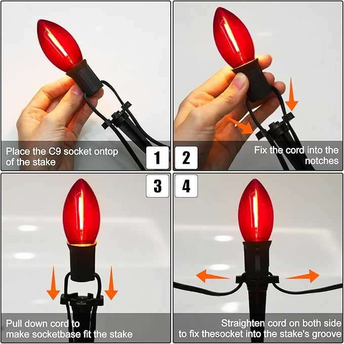 - SAFETY & ENERGY SAVING: Christmas Pavement Lights, 27pcs C9 coloured led bulbs (2 spare bulbs) fit E17/C9 base socket, 0.6W / bulb, 120V, Christmas passageway stake lights, UL approved, for indoor and outdoor decoration and lighting. If one bulb goes out does not affect the other bulbs.