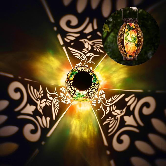 - 【Unique Hummingbird Glass Outdoor Light】The hanging glass solar lantern has a colorful hummingbird pattern and a beautiful metal hollowed-out design. The hummingbird solar light is equipped with durable handles and can be hung in gardens, courtyards, porches, and trees, as well as placed on tables or the ground, making your garden more beautiful.