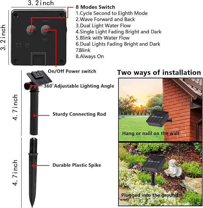 - 8 Modes Setting & Memory Function:The string lights for outside have an On/Off button and a Mode button, press the mode button to select 8 different modes to satisfy your diverse needs. The outdoor solar lights built-in memory function saves your last mode setting, eliminating the need to reset it every day.
