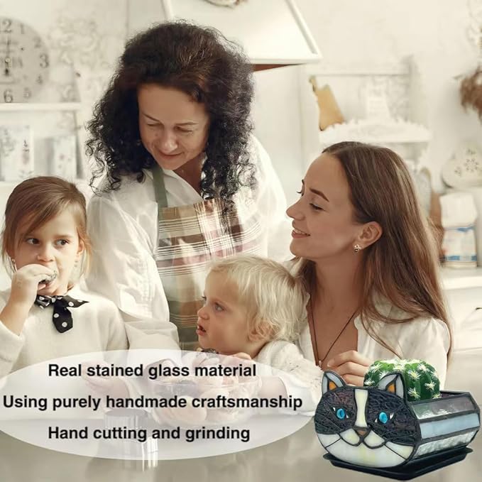 - This cat flower pot is made of real stained glass, and each piece of glass is cut and ground by hand by craftsmen; the pursuit of perfect craftsmanship creates this colorful glass flower pot craft