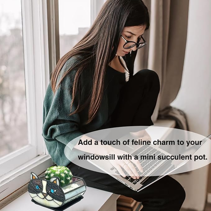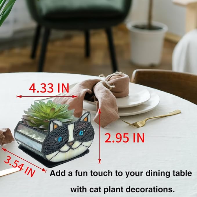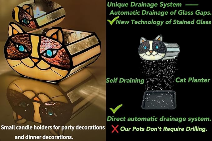 - Looking for a unique and beautiful way to display your plants;Tiffany's Adorable Cat Stained Glass Planter;Made with a corrosion-resistant pure copper frame, these pots are not only functional but also beautiful. Each flower pot is handcrafted and can be used for planting, dried flower arrangement, candle holder, pen or cosmetic brush holder and so on. Perfect for decorating your dining table, living room, or anywhere else you want to add whimsy and charm