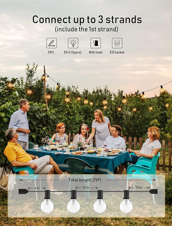- Connectable and portable outdoor lights: 25*2 hanging sockets, 6 inch lead with male plug, 12 inch spacing between bulbs, 6 inch tail with female connector, total length 25 feet. End to end connect up to 3 strands. Portable size for easy carrying and storage