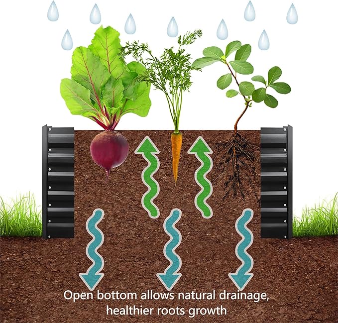 - OPEN BOTTOM: Sits on the ground garden bed, allows natural drainage, prevent waterlogging and root rot. It encourages the plants’ roots to grow deep into the ground, promoting stronger and healthier plants.