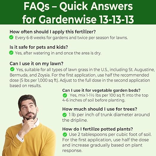- ๐ฟ Balanced 13-13-13 Fertilizer for Outdoor Plants: Provides 13% Nitrogen, 13% Phosphorus, and 13% Potassium for optimal growth. Perfect for lawns, vegetable gardens, rose bushes, flowers, shrubs, and trees. Ideal for St. Augustine grass, evergreens, and all outdoor plants.