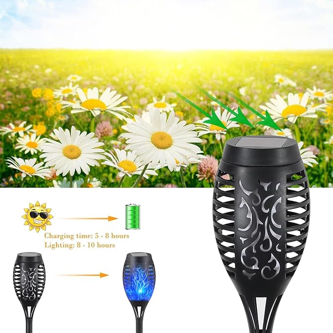 - Solar-Powered Outdoor Lights: Equipped with a solar panel, FAISHILAN solar torches can work for up to 6-8 hours in summer and 4-6 hours in winter after being fully charged. FAISHILAN solar-powered outdoor lights will provide vivid and dancing outdoor decor for gardens, patios, parties, camping, BBQs, and holidays