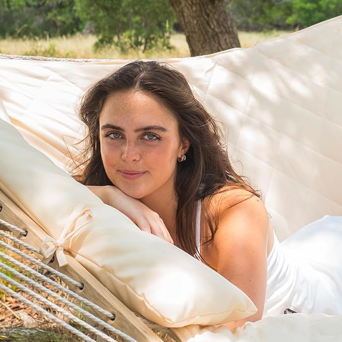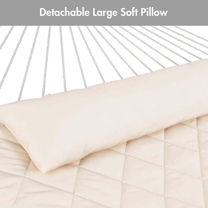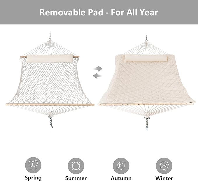 - COMFORTABLE & DURABLE: Double-layered quilted polyester fabric with inner polyester wadding is soft, breathable and long-lasting. Special sewing design increases the beauty and practicality of hammock swing. Extra polyethylene stuffing head pillow offers you superior comfort. Hammock pad is detachable for easy cleaning. It will not fade after long-term use